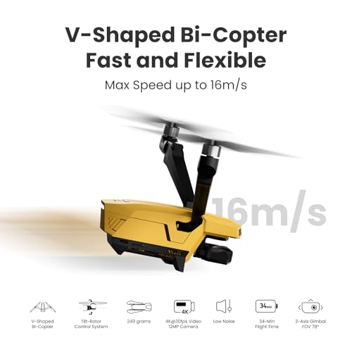 Specification: Drones with Camera for Adults 4K, VCOPTER Falcon Mini Bi-Copter Design, Inverted Flight Capability, Max Speed 16m/s, 10000 ft Video Transmission, 1 Battery for 34-Min Max Flight Time, 249g