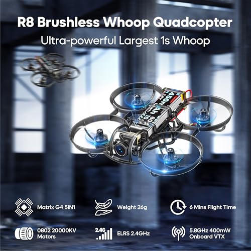 Specification: R8 ELRS Brushless Whoop Quadcopter, Ultralight 1S 80mm Micro FPV Drone BNF with 6 Port Battery Charger,2 Batteries Fly12 Mins for FPV Freestyle Racing Indoor Outdoor,FOV160°,Matrix G4 5IN1 FC,0802 20000KV Motor
