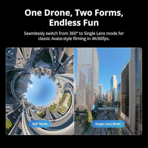 360° & Single Lens, Flexible Dual Modes – Seamlessly switch from 360° to Single Lens mode for classic Avata-style filming in 4K/60fps [4]. With 360° and aerial filming in one device, it’s the only drone you need to pack.